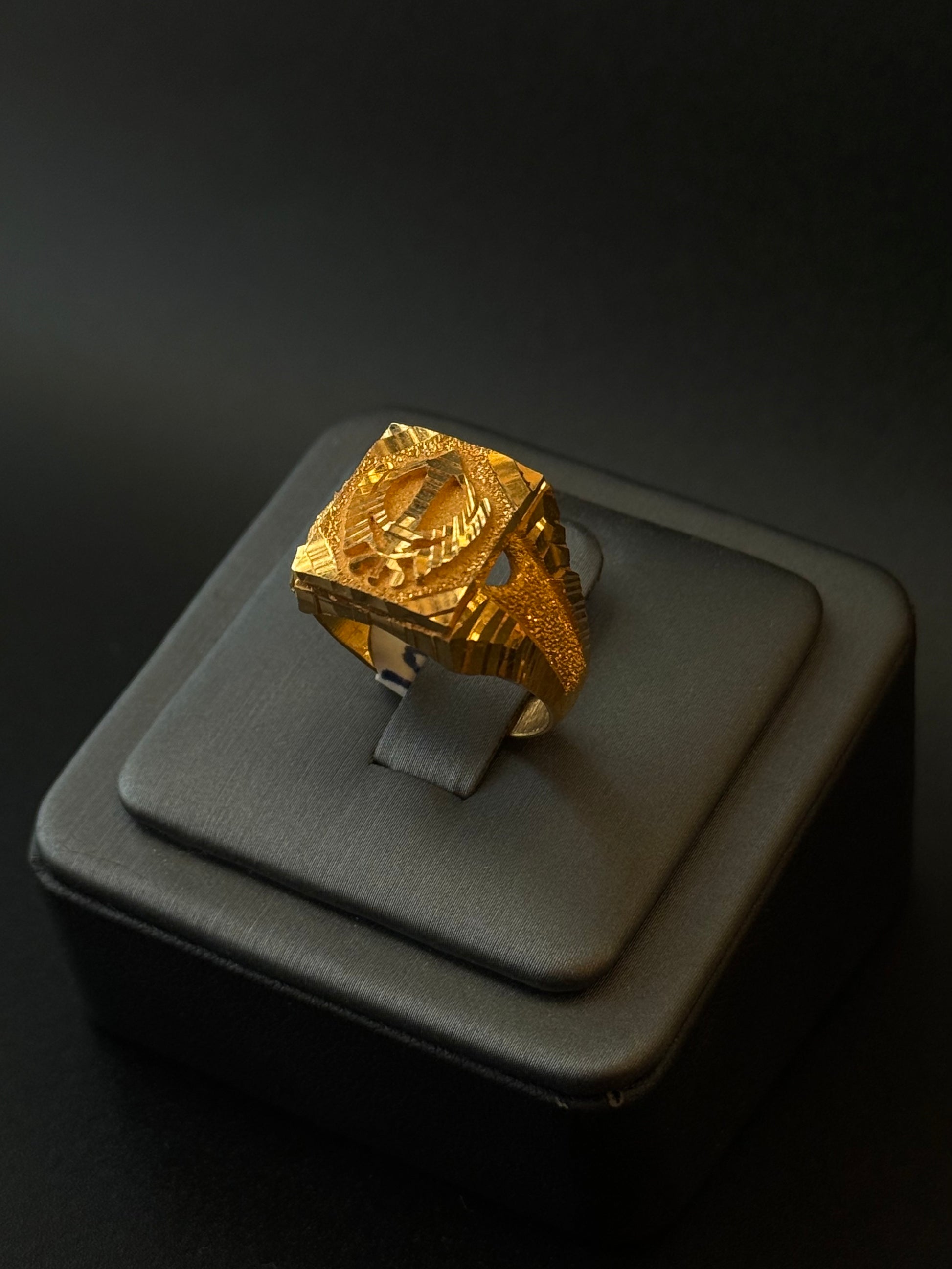 This 22-karat gold men's ring features a precise Khanda design prominently displayed on the top. Machine-cut details combined with sand-finished patterns on both the top and sides create a textured, refined look that highlights expert craftsmanship. The ring offers a bold yet elegant statement, reflecting tradition with contemporary finishing techniques for lasting appeal.