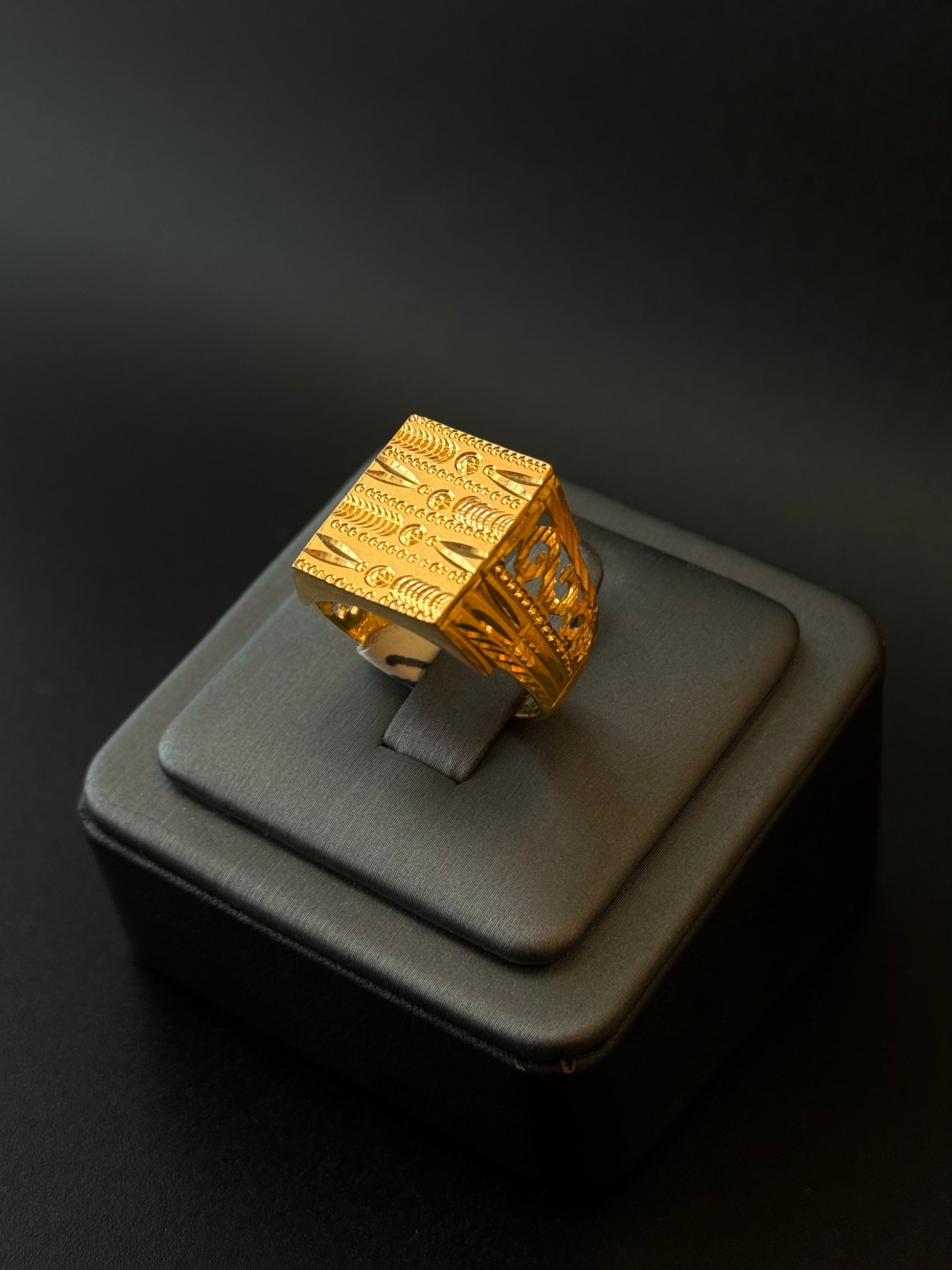 This 22-karat gold men's ring is distinguished by its intricate geometric patterns, expertly crafted to create a balanced and modern aesthetic. The precise detailing enhances the ring's visual appeal while maintaining a smooth finish for comfortable wear. Combining traditional gold purity with contemporary design, this ring offers a sophisticated accessory for discerning individuals.