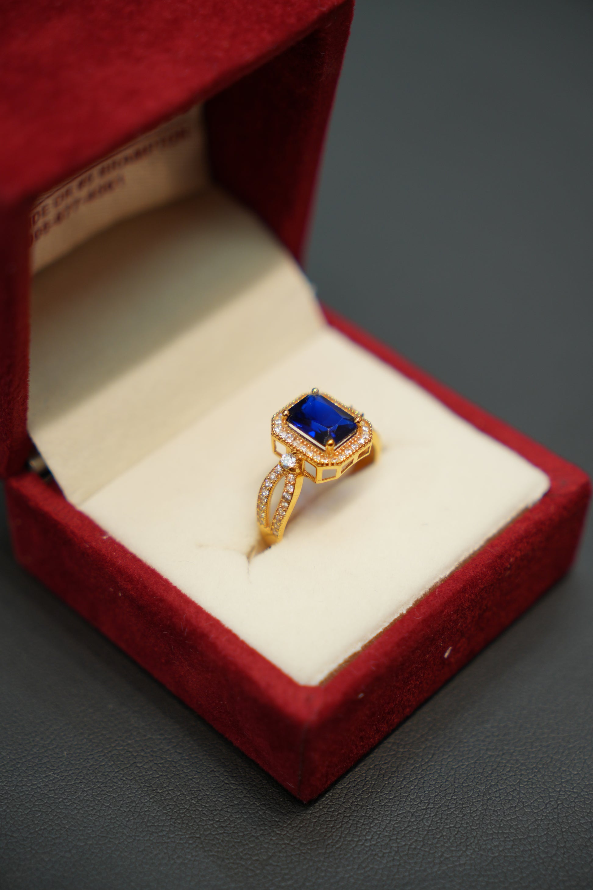 22K Gold Ring with Blue Centre Stone Elegantly crafted in 22K gold, this sophisticated ring features a striking rectangular blue stone at its centre, surrounded by a delicate border of complementary stones. The warm lustre of 22K gold enhances the deep allure of the blue centrepiece, creating a timeless piece that balances contemporary design with traditional craftsmanship. Perfect for those seeking refined jewellery with distinctive character and enduring appeal.