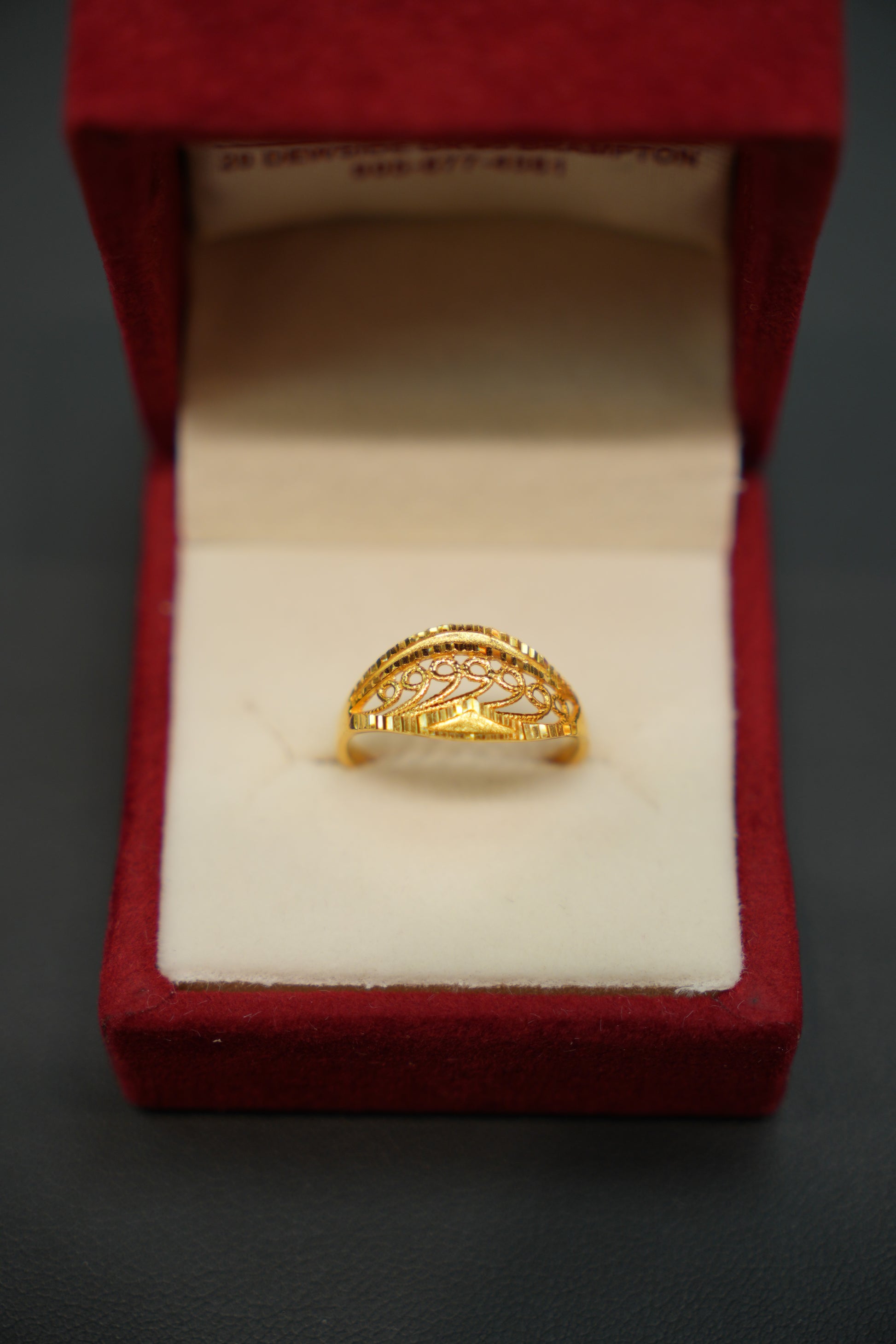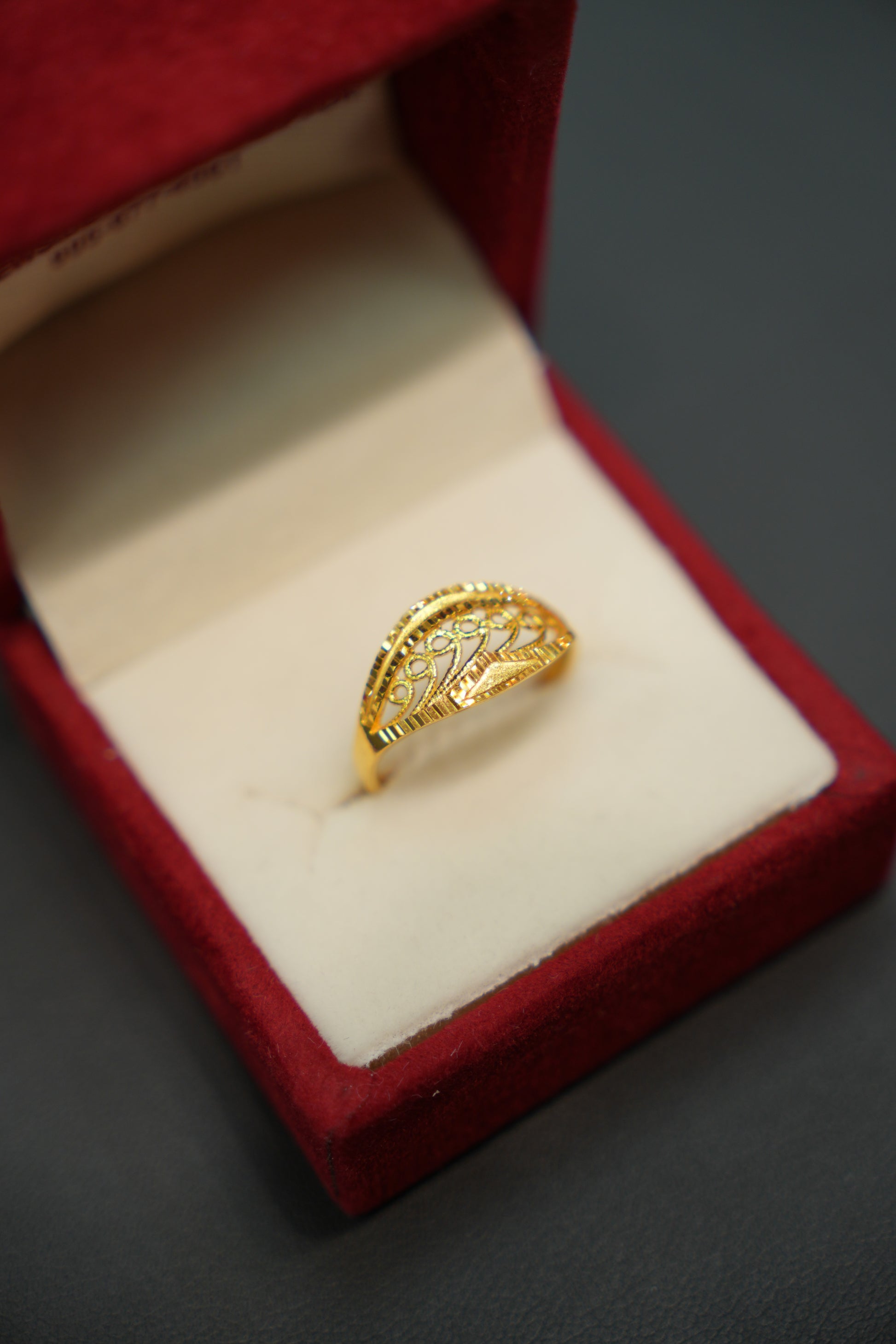 This exquisite 22K gold ring combines flowing swirl detailing across the bands and centre with a graceful floral pattern throughout. The sculptural swirls create dimension and movement, while the botanical elements add organic elegance. Crafted in pure gold, this piece offers a harmonious blend of architectural design and natural inspiration—a sophisticated choice for those seeking distinctive character and refined beauty.