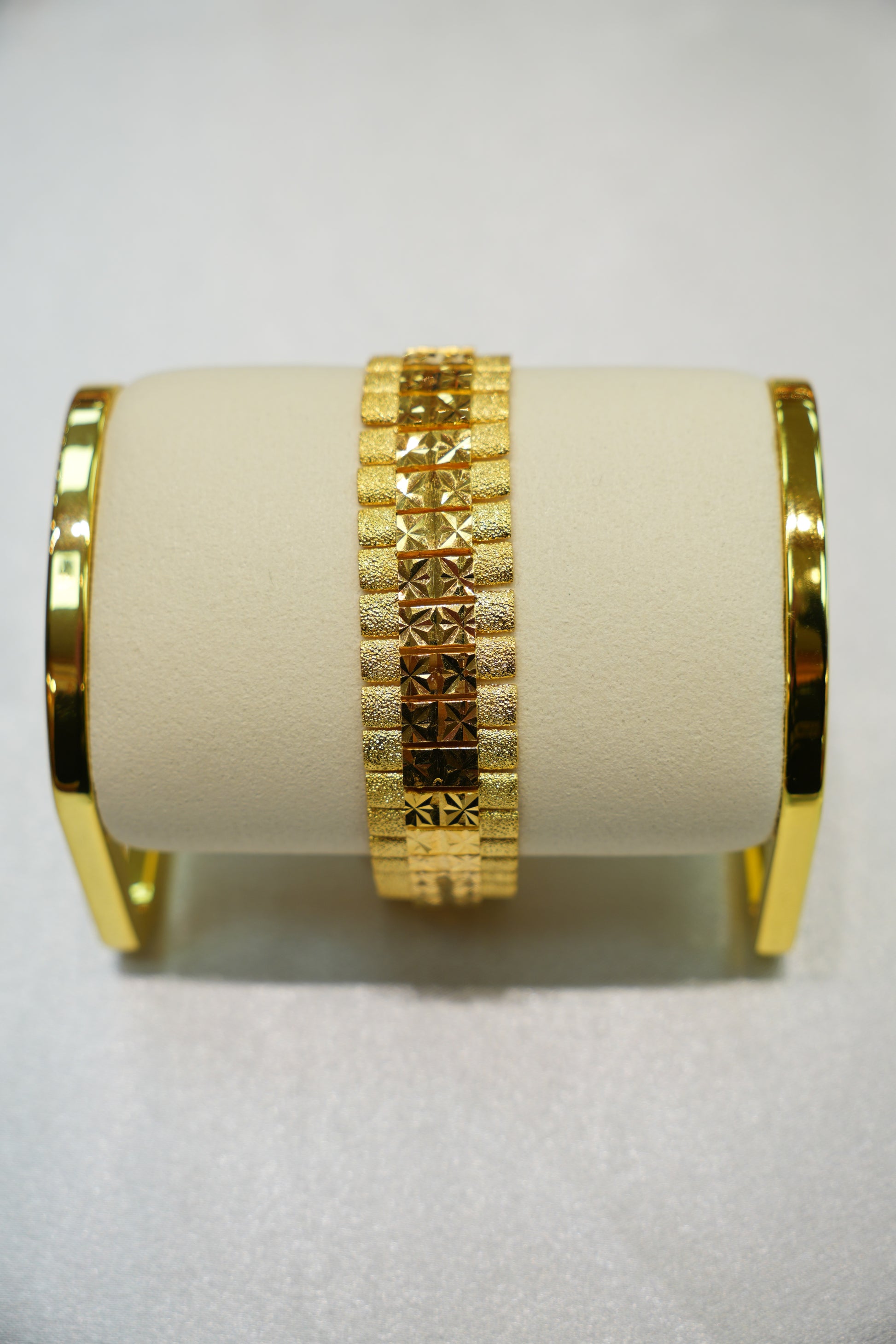 Crafted in radiant 22 karat yellow gold, this men's bracelet is a bold yet refined expression of timeless luxury. Featuring the classic Cuban link design, each link is solid, wide, and smoothly contoured, forming a striking pattern of interconnected symmetry. The links lie flat against the wrist, creating a smooth, flexible feel while maintaining a strong and structured silhouette.