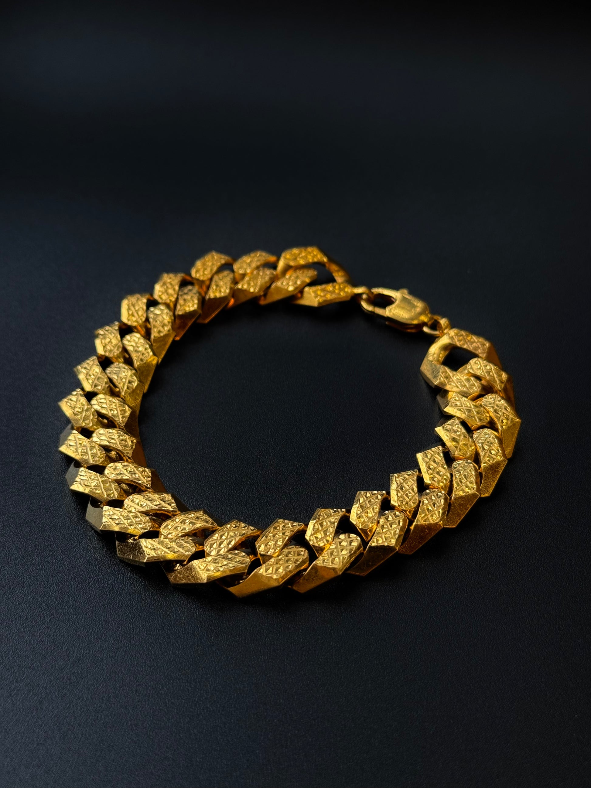Crafted in radiant 22 karat yellow gold, this men's bracelet is a bold yet refined expression of timeless luxury. Featuring the classic Cuban link design, each link is solid, wide, and smoothly contoured, forming a striking pattern of interconnected symmetry. The links lie flat against the wrist, creating a smooth, flexible feel while maintaining a strong and structured silhouette.